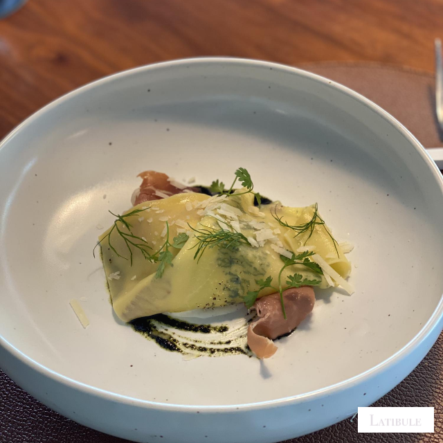 오픈 허브 라비올리에요. 안에는 수란과 하몽이 들어가 있어 소스 찍어 같이 먹으면 맛있어요.