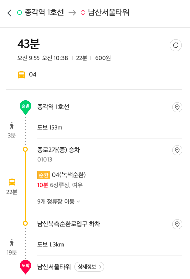 종각역(1호선)에서 종로 3가 방향으로 가는 04번 버스(녹색순환)를 타면, 9개 정류장(21분 소요)을 지나 남산에 도착하게 됩니다.