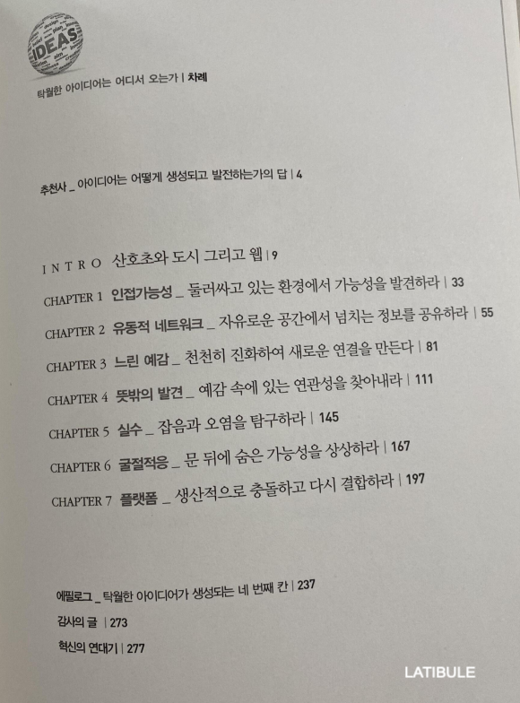 훌륭한 아이디어를 인접가능성, 유동적 네트워크, 느린 예감, 뜻밖의 발견, 실수, 굴절적응, 플랫폼이라는 7가지 키워드로 정리했습니다.