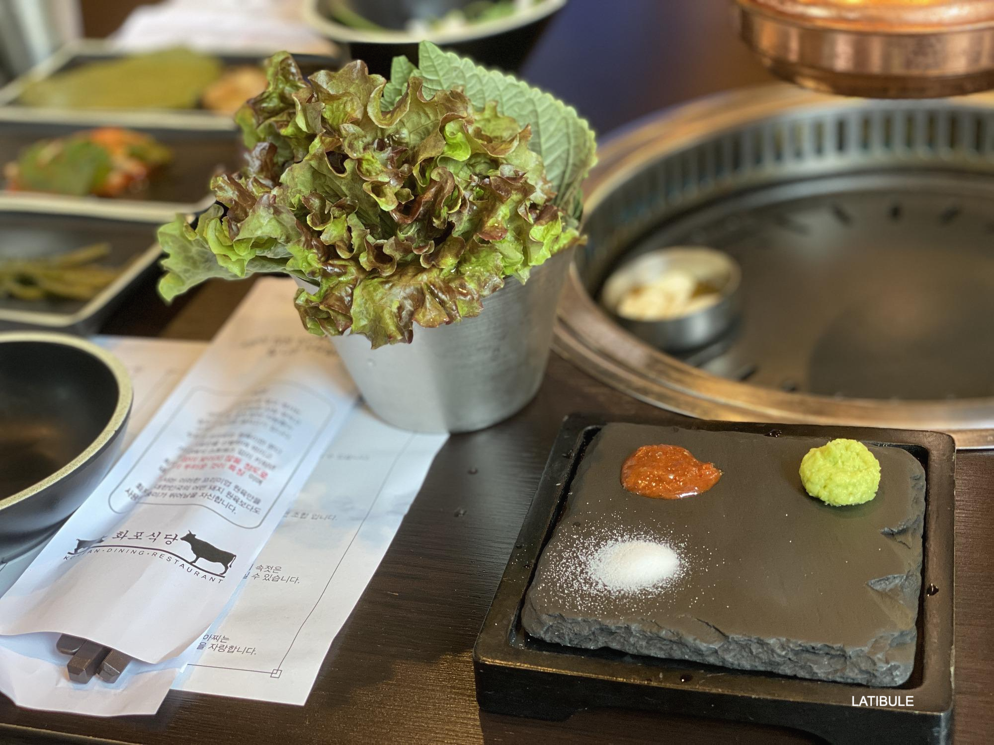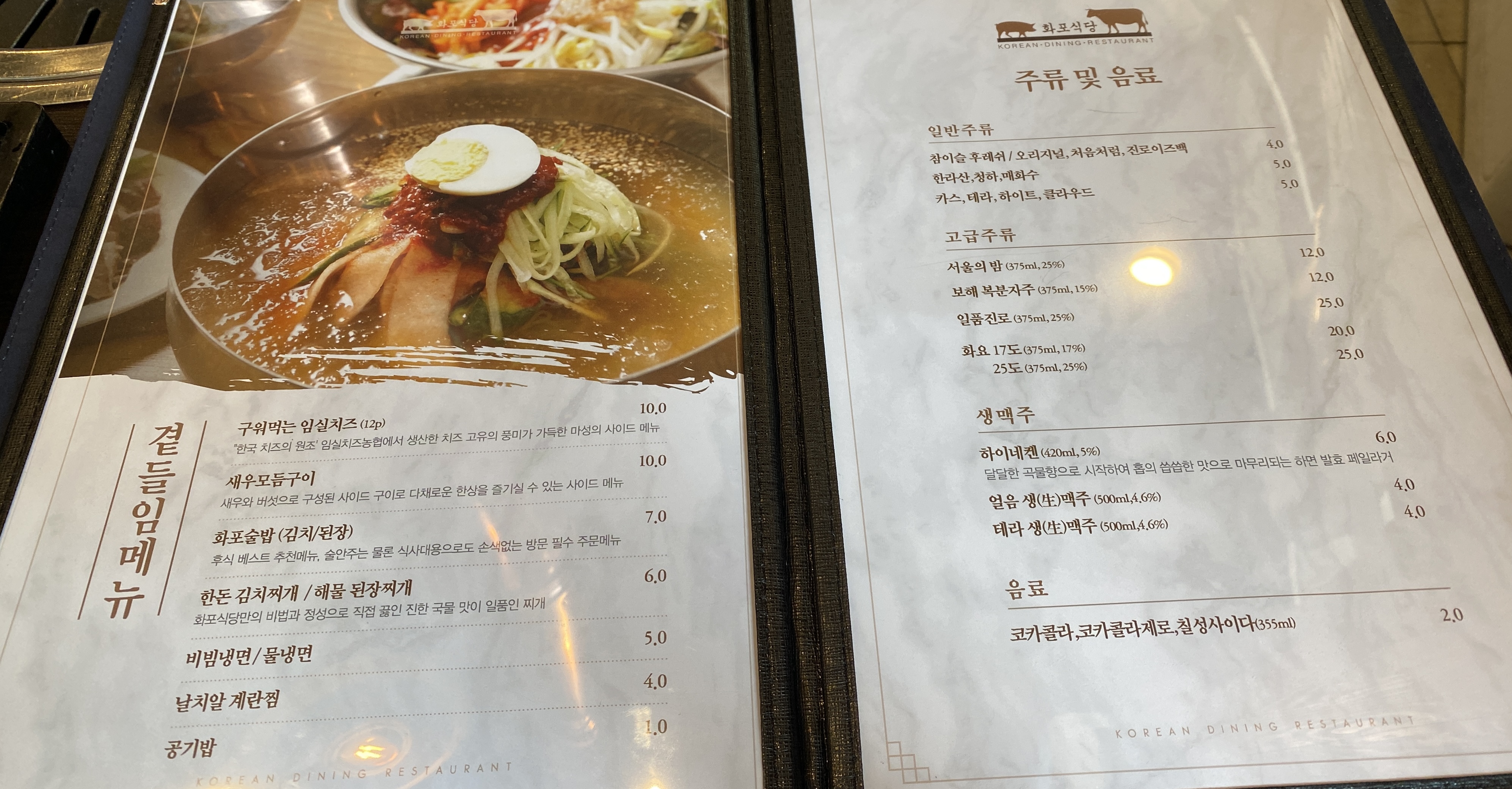 테이블에 화포 육류를 제대로 즐길 수 있는 방법이 기재되어 있는데요.