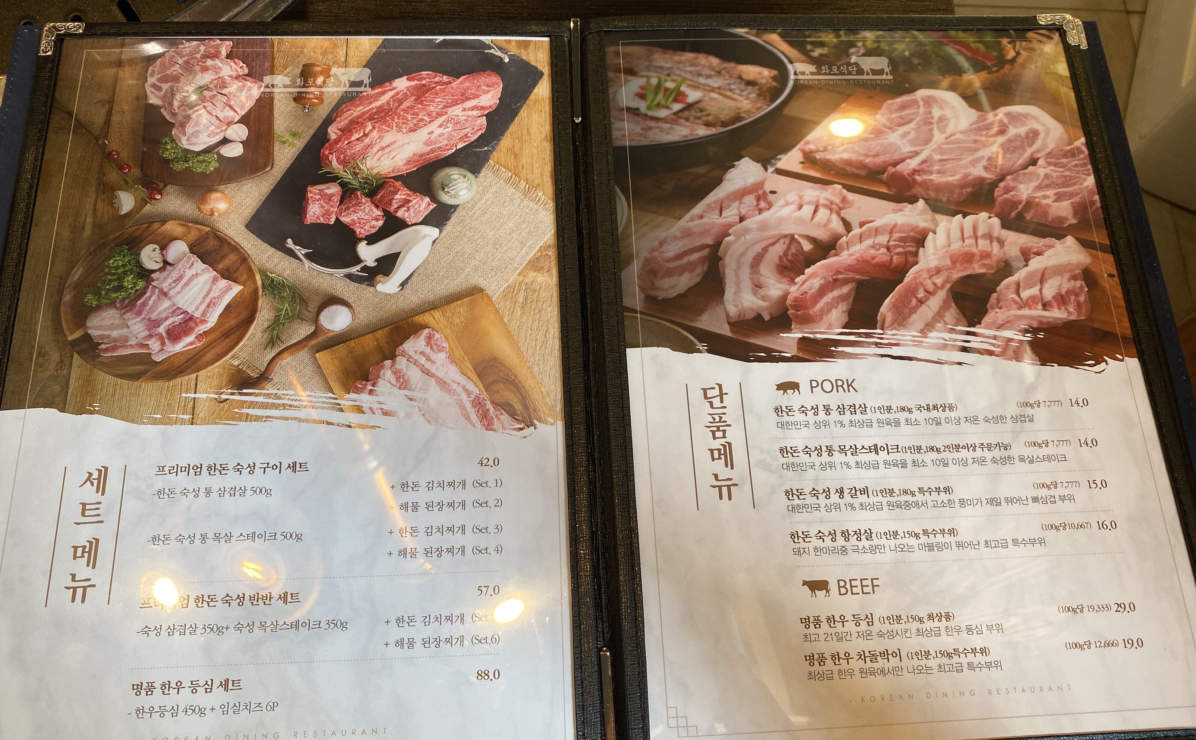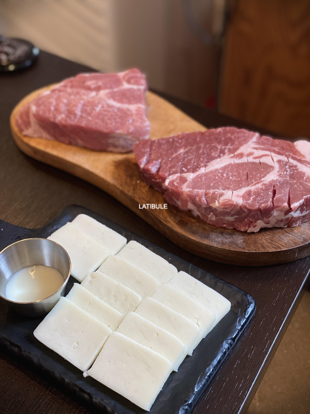 프리미엄 한돈 숙성 구이 세트를 시키면, 삼겹살 or 목살 중 택 1 + 김치찌개 or 된장찌개 중 택 1해서 드실 수 있어요.