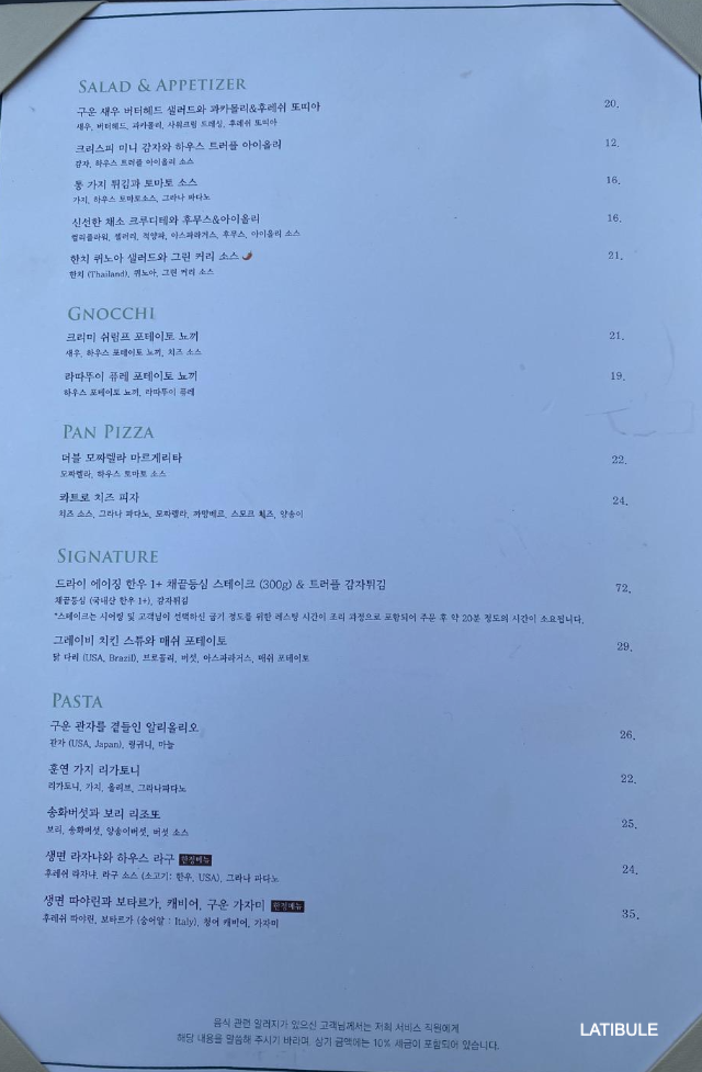 샐러드, 에피타이저 / 뇨끼 / 팬피자 / 파스타 / 시그니처 / 음료로 구성되어 있었습니다.