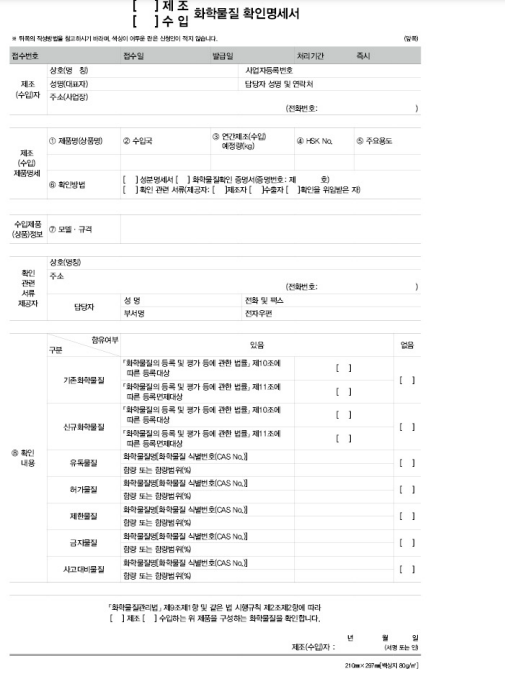 - 화학물질 제조/수입자는 제조 또는 수입 전에 규제대상 화학물질 해당여부를 스스로 확인하여 <한국화학물질관리협회>에 "화학물질 확인명세서"를 제출해야 합니다.