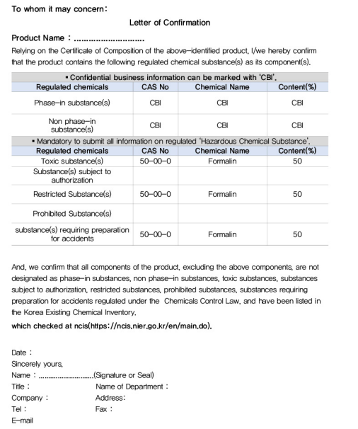 성분명세서나 화학물질 확인증명서 또는 LOC(Letter of Confirmation) 중 한 가지를 첨부해야 합니다.