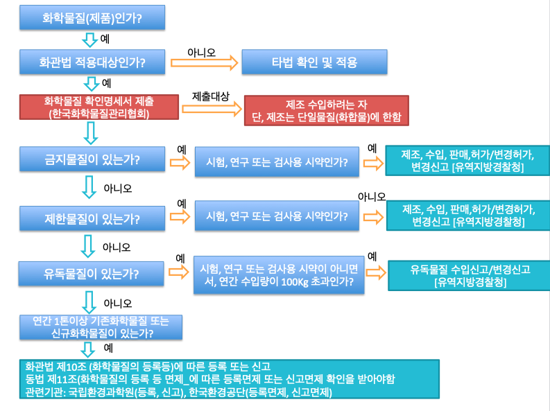 다만, 모든 화학물질을 제조/수입하려는 자는 제조 또는 수입(통관) 전에 "화학물질 확인명세서"를 <한국화학물질관리협회>(http://www.kcma.or.kr/main/main.asp)에 제출해야 합니다.
