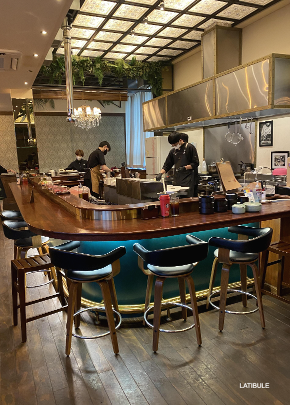 아래와 같이 바 테이블에 앉아서 먹으면, 눈앞에서 즉석에서 요리해주시는 코스요리를 즐길 수 있다고 합니다.