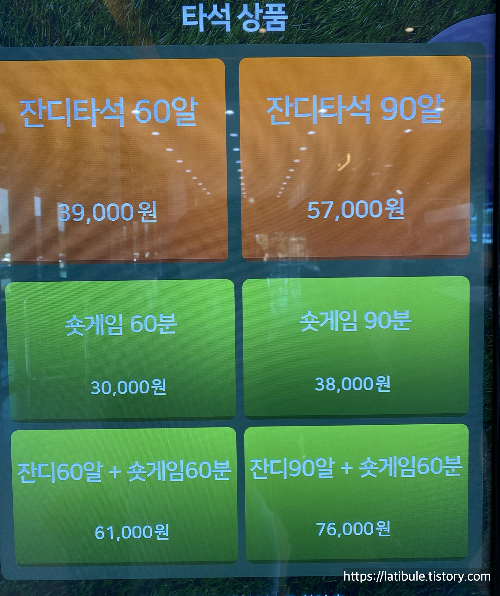 잔디타석은 공 개수로, 숏게임은 시간당으로 되어 있어요.