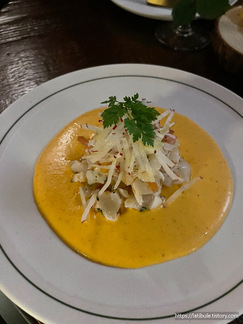 도가니볼(5pcs)(18,000원)과 홍새우 가스파초(24,000원)을 먹었습니다.