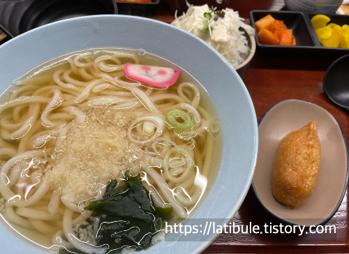 사이드메뉴로 나오는 유부초밥이 또 우동과 잘 어울리는 별미로 맛있었습니다.