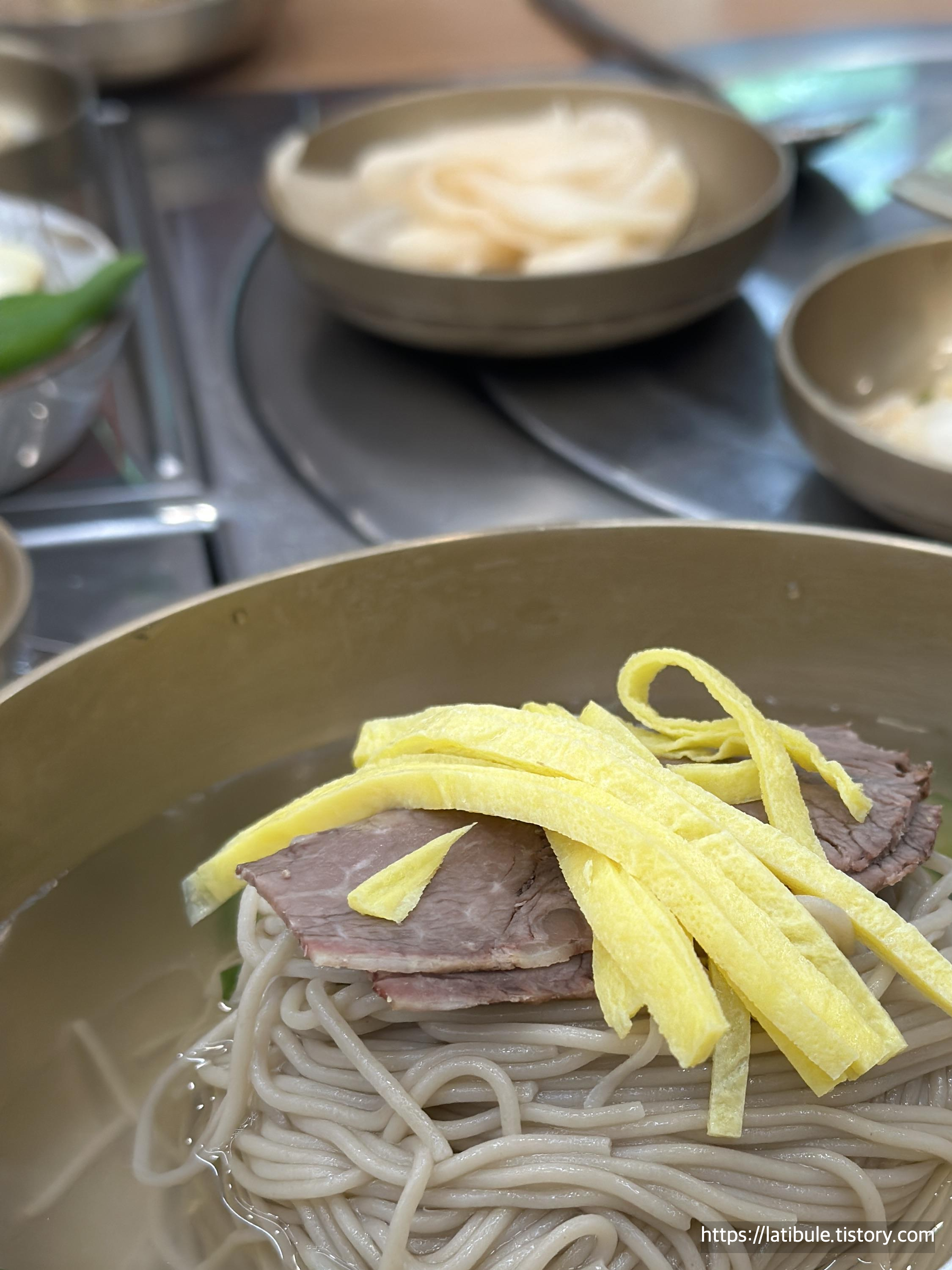 메밀국수 사리에 고명을 얹고 식힌 고기 국물과 동치미 국물 등 찬 국물을 부어 만든 평양의 향토 음식이라고 합니다.